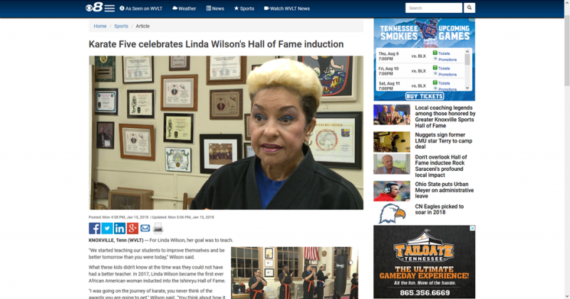 WVLT Local 8 Television January 2018 interview with Master Linda Wilson at the Karate Five Dojo aired January 15, 2018. This link is also located under the HOME PAGE's feature Articles page.