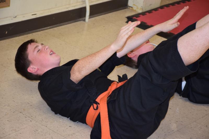 (Below) Students meet the challenge of Sensei Wilson's physical conditioning and strengthening routines.